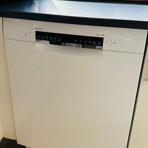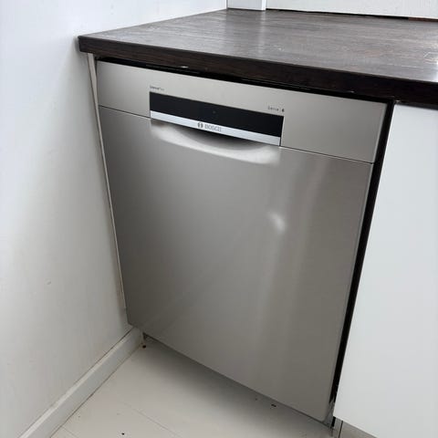 Bosch opvaskemaskine underbygget i hvid. Købt medio 2022. Modellen er beregnet til montering under bordplade. Maskinen har frontbetjent kontrolpanel med flere vaskeprogrammer og tydelig displayvisning. Indvendigt er der tre niveauer: bestikbakke øverst samt to kurve med justerbare sektioner til tallerkener, glas og køkkenredskaber.