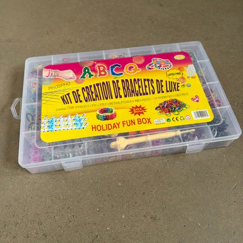 Rainbow Loom smykkesæt med elastikker i mange forskellige farver. Sættet indeholder en opbevaringsboks med rumopdeling til elastikkerne samt diverse små dele til at samle armbånd og andre smykker. Velegnet til kreativ leg og fremstilling af armbånd, ringe og andre små accessories af elastikker. Sættet er beregnet til børn fra 8 år og opefter, jf. emballagen.