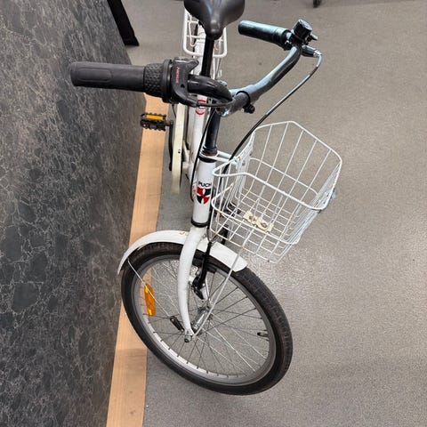 Børnecykel med 20" hjul i hvid og lilla. Cyklen har lav indstigning, bagagebærer, støtteben og kurv foran. Velegnet til børn, der passer en cykel med 20" hjulstørrelse.
