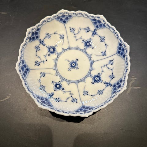 Royal Copenhagen Musselmalet skål i porcelæn. Skålen er dekoreret i blå-hvidt mønster og har gennembrudt kant med bølget form. Den står på lille fod og har en facetteret, sekskantet inderside. Størrelsen er ca. 10 cm på det bredeste sted, velegnet som lille serveringsskål eller dekorationsskål.