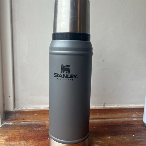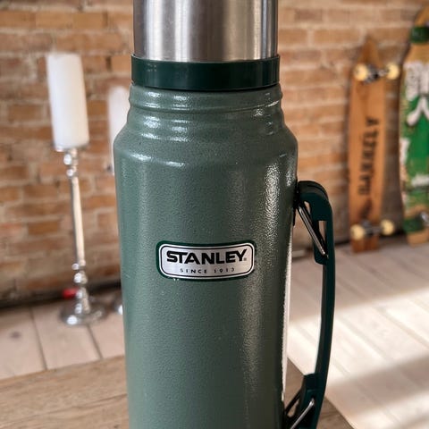 Stanley Classic termoflaske på 1 liter i grøn farve. Fremstillet i rustfrit stål med dobbeltvægget vakuumisolering. Holder varme drikke varme op til 24 timer og kolde drikke kolde op til 24 timer, samt isede drikke kolde op til 5 dage. Flasken er lækagesikker, BPA-fri og tåler opvaskemaskine. Udstyret med bærehåndtag og skruelåg, der også kan bruges som kop. Velegnet til fx kaffe, te eller andre varme og kolde drikke på ture, arbejde eller rejser.