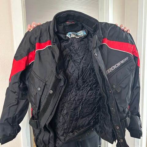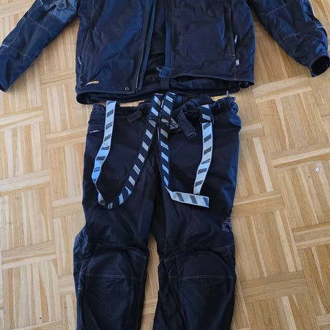Samlet pris men kan købes enkeltvis for: Lookwell Stayer motorcykel sæt bestående af jakke og bukser for kr 1.000, samt en Shoie integralhjelm for kr. 800. Jakken S/M er i sort, lilla og grå med flere justerbare stropper og aftagelig for. Bukserne S/M er sorte med forstærkede knæpartier og reflekser nederst på benene. Integralhjelmen S/M sort med klart visir. Kevlar handsker st. 7 og nyrebælte M for kr. 300