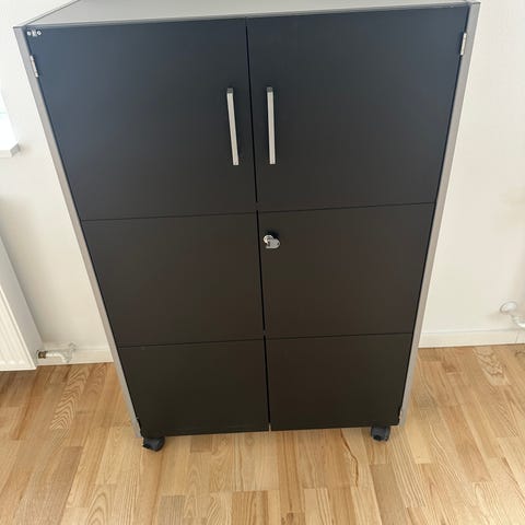 Skabet lukkes med jalousilåge i plast. Hylde er justerbar. Har fire drejelige hjul som gør det nemt at flytte rundt på. Hul i siden til evt ledninger eller andet. Velegnet under en skrivebord.