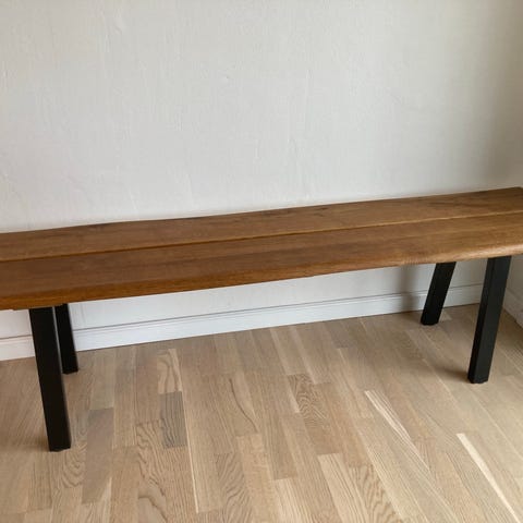 Meget, meget lækker egetræsbænk, sortmalet. Har været brugt son TV- bænk med afsætningsplads til coffeetable bøger, planter mm. Med sin længde på 195 cm kan den også passe ind i køkkenet med plads til fire ved langbordet. Bænken et købt i den kendte livsstilsbutik Hunter i Nordsjælland, som desværre ikke længere eksisterer. Der er desværre heller ikke et mærke angivet, men butikken havde bænkene i tre forskellige længder. Denne er den længste. Det er med stor beklagelse jeg må konstatere at jeg ikke længere har plads til den i min stue. Den står som ny og har lækker møbelsnedkerfinish. Nyprisen vurderes til i dag at være 6.500kr. Den kan hentes på Nørrebro