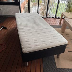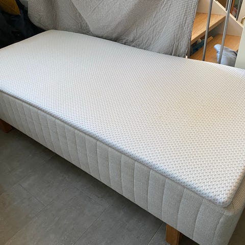 Luna boxmadras med formspændt bøgetræsben og topmadras. Alt i pæn stand. Har været brugt til gæsteseng.