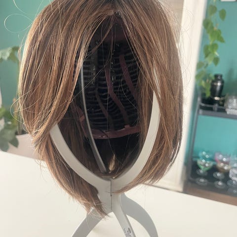Parryk med langt, bølget syntetisk hår i brun nuance med lyse striber.