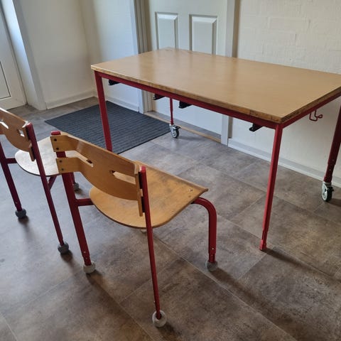 Plastik børnebord og stol i rød farve. Sættet består af et rektangulært bord med kraftige ben og en matchende stol med ryglæn. Egnet til indendørs og udendørs brug, f.eks. legehus, legehjørne eller på terrasse. Velegnet til mindre børn på grund af lav højde og let materiale, der er nemt at flytte og rengøre.