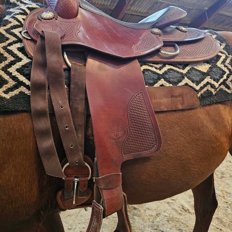 Western sadel i brun læder. Sadel med udskæringer og dybe sædekanter. Undersiden er polstret, og der medfølger underlag i tekstil med striber i rød, blå og beige. Egnet til westernridning eller som brugssadel til hest, hvor der ønskes en dyb og stabil sædeform.