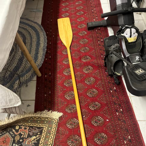 Træ årer til robåd. Klassiske årer i træ med røde åregafler/holdere. Egnede til brug i robåd eller jolle - ca. 180 cm. Gamle og med tydelig brugsmærker, men helt ok.