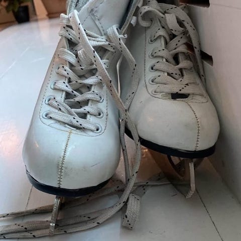 Ukendt mærke kunstskøjter i størrelse 38. Klassiske hvide skøjter med snørelukning og høj skaft, som giver støtte om anklen. Egnet til skøjteløb på is for børn eller mindre fødder. Blad i metal med hæl og tåspids, typisk til kunstskøjteløb. Farve: hvid.