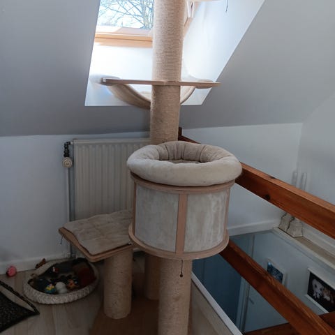Ovenpå kradsetønden er der en udsigtsplads med en meget hyggelig seng. Ved den ekstra høje kant kan din kat læne sig op af og døse eller kigge ud over sit territorium, højt hævet over verden.