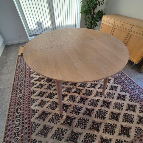 “Laurits M. Larsen spisebord sælges uden tillægsplader. Bordet har nogle mindre ridser, men de er ikke særlig tydelige og påvirker ikke helhedsindtrykket. Et solidt og flot spisebord.