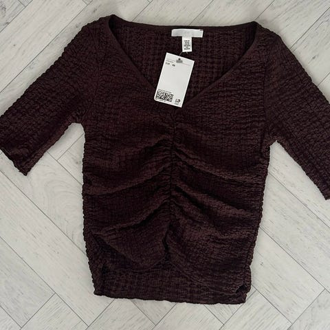 H&M Basic T-shirt til kvinder i størrelse M. T-shirten er blå og har rund hals og korte ærmer. Materialet er en blanding med hovedsageligt polyester, som gør den let og behagelig at have på. Velegnet som hverdags-T-shirt eller som basislag under andet tøj.