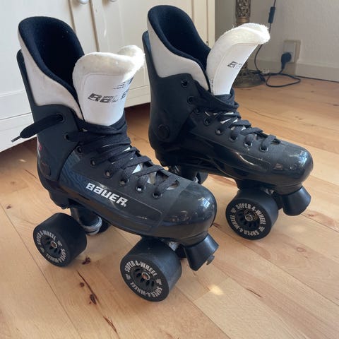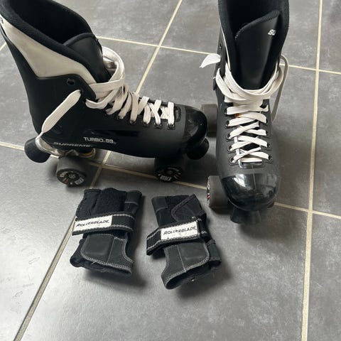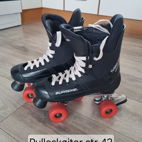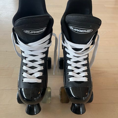 Supreme rulleskøjter i sort med røde hjul i børnestørrelse one size. Klassiske quads med fire hjul, snørelukning og høj skaftstøvle for støtte om anklen. Hjulene er monteret på metalstel, og skøjterne har hvide snørebånd. Velegnet til rulleskøjteløb på glatte overflader som indendørs gulve og jævne udendørs underlag.