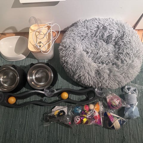 Sæt med kattetilbehør bestående af flere dele i neutrale farver.