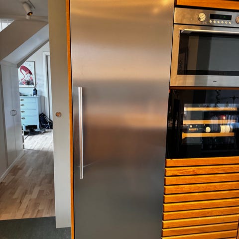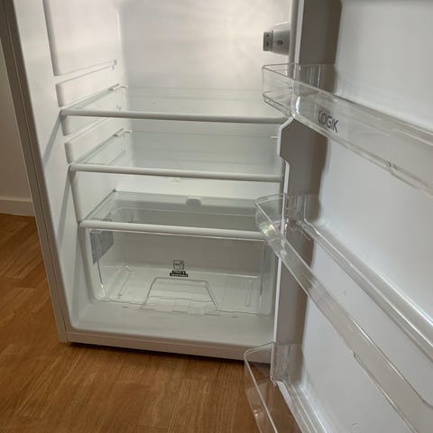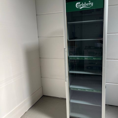 Køleskab med glaslåge og indvendige hylder. Skabet har gennemsigtig front, så indholdet kan ses udefra. Egnet til opbevaring og køling af drikkevarer eller madvarer i f.eks. bryggers, værksted eller mindre erhvervsmiljøer. Indvendig belysning og mekanisk temperaturvisning kan forekomme afhængigt af model.