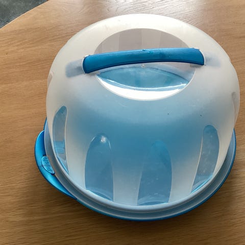 IKEA kagefad med gennemsigtigt plastlåg, egnet til opbevaring og servering af kager eller tærter. Medfølgende klare glas på fod, der kan anvendes til fx dessert eller drikkevarer. Derudover en lille kande i hvidt materiale med grønne detaljer og hældetud, velegnet til servering af fx mælk, fløde eller sauce.