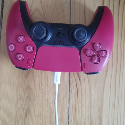 Sælger en stilfuld mørkerød DualSense-controller til PS5. Den er renset og rengjort, uden synlige brugsspor, og begge analog-sticks er udskiftet til Hall-effect-sticks — stick-drift er elimineret. Perfekt til konkurrencespil eller som opgradering til din opsætning.