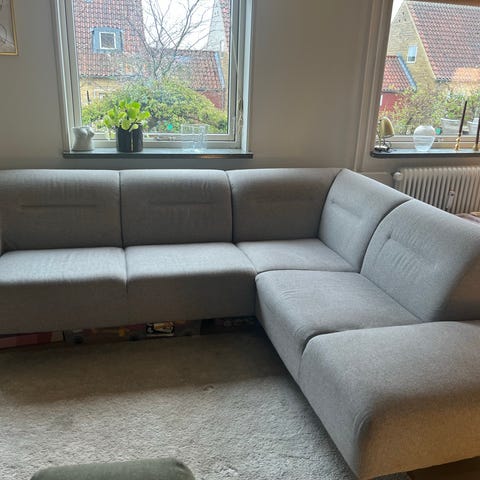 Sofa i form af hjørnesofa i mørkegråt stof. Sofaen har chaiselong i den ene side og faste ryghynder. Den er polstret hele vejen rundt og står på lave ben. Velegnet som sidde- og loungemøbel i stue eller opholdsrum.