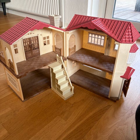 Sylvanian Families dukkehus med flere etager og rødt tag. Huset er udført i plast med detaljerede vinduer, døre og altan. Indvendigt er der flere rum fordelt på to etager samt åbne sider, der gør det let at lege i huset. Velegnet til Sylvanian Families figurer og møbler
