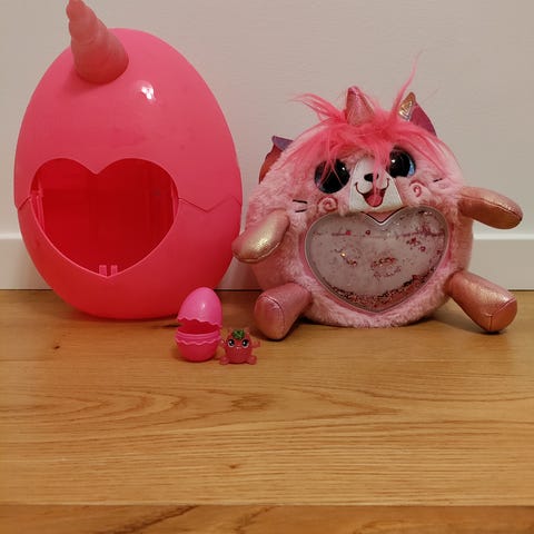 4 Squishmallows, rainbowcorns. Sættet omfatter store og mindre plysdyr formet som fantasidyr, blandt andet med enhjørningehorn, hale og kaninører. Figurerne leveres sammen med matchende plastæg og skaller i forskellige farver, som kan bruges til opbevaring eller leg. Egnet som krammedyr og rolleleg for børn, der kan lide bløde plysdyr og fantasifulde figurer.