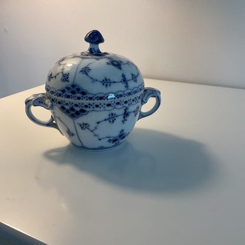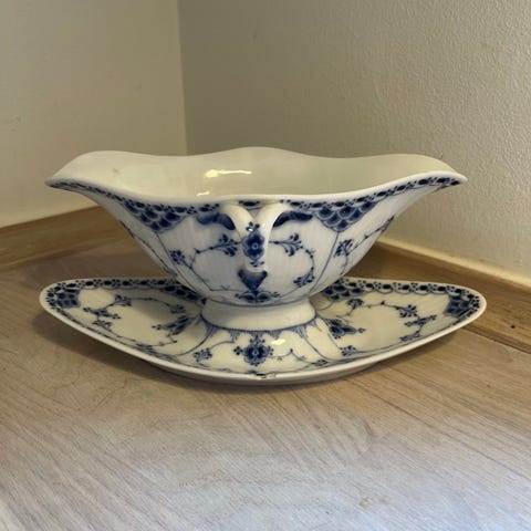 Royal Copenhagen tallerken i porcelæn. Tallerkenen er hvid med blå dekoration og rillet kant. Bunden er stemplet med Royal Copenhagen-mærke og dekorationens koder. Velegnet som middagstallerken eller serveringsfad i et klassisk stel med blåmalet mønster.