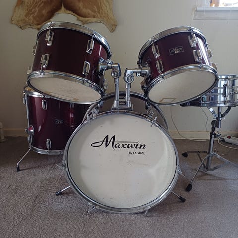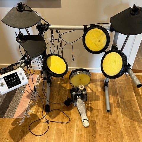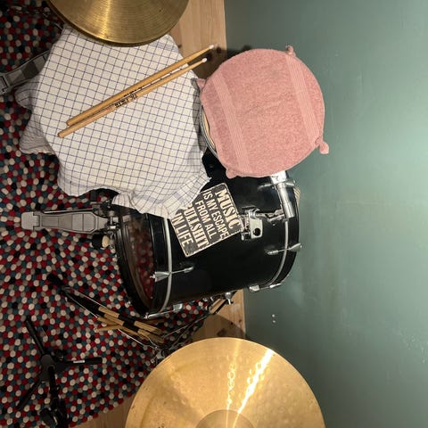 Bigbeat trommesæt. Sættet består af stortromme, lilletromme og tammer monteret på stativ. Pris 400 kr.