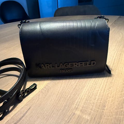 Karl Lagerfeld taske i sort. Tasken er fremstillet i bomuldsstof med trykt logo på forsiden. Åbnes og lukkes med trykknap. Indvendigt ét hovedrum med plads til mindre hverdagsting som telefon, pung og nøgler.