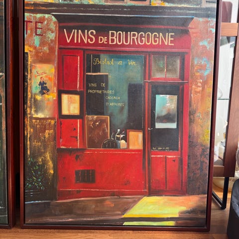 Maleri oliemaleri med cafémotiv, hvor flere personer sidder ved borde og er i samtale. Motivet er udført i en løs, ekspressiv stil med tydelige penselstrøg og dæmpede farver. Billedet er indrammet i en klassisk ramme og er klar til ophængning med monteret ophængswire på bagsiden. Velegnet som vægdekoration i stue, kontor eller andre opholdsrum.