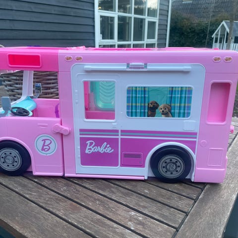 Barbie campingbil legetøjsbil i pink plast. Bilen kan åbnes op, så der skabes et indvendigt legeområde med detaljer som siddepladser og indretning trykt på væggene. Forenden kan skilles fra resten af bilen og bruges som separat køretøj. Egnet til leg med Barbie-dukker og lignende dukker i tilsvarende størrelse.