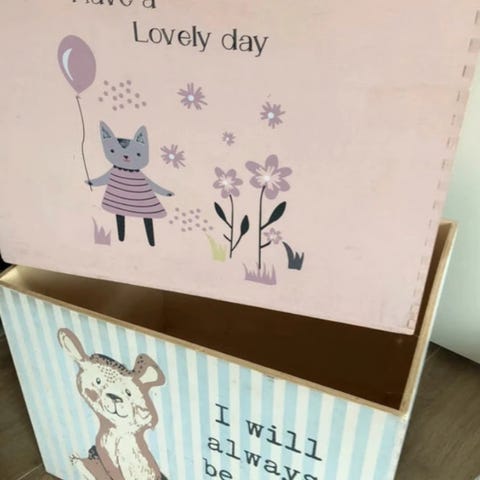 2 stk. spændende opbevaringskasser i blåt træ. På kasserne er der henholdsvis malede ballerinaer og soldater på 4 af siderne. Med få brugsmærker. Stor kasse mål : 3 x 29,2 cm. til kr. 75. Lille kasse mål: H 17, 7 cm B+D 21 cm til kr. 60. Fra Coop Norden, Stockholm