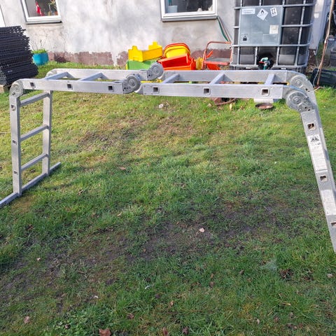 Multifunktionsstige, der kan anvendes som arbejdsplatform. Stigen er udført i metal og har flere led, så den kan justeres og låses i forskellige positioner. Øverst er der en platform, som giver et stabilt underlag til arbejde i højden, fx ved maling, rengøring eller mindre håndværksopgaver. Velegnet til brug udendørs på faste, jævne underlag