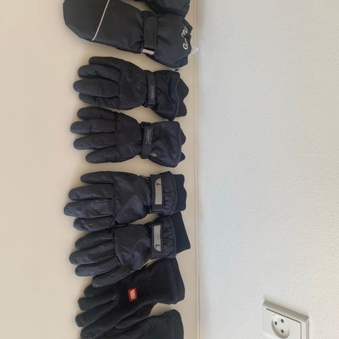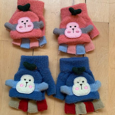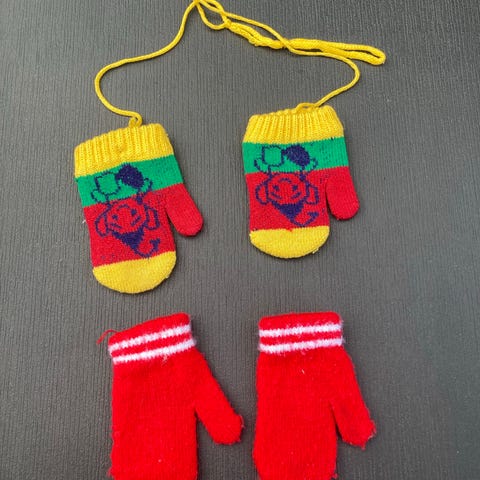 vanter one size. Sættet består af et par multifarvede vanter med snor og motiv på håndryggen samt et par ensfarvede røde vanter med hvide striber ved håndleddet. Begge par er strikkede og er velegnede til børn Vanterne kan bruges til hverdag og udendørs aktiviteter i køligere vejr.