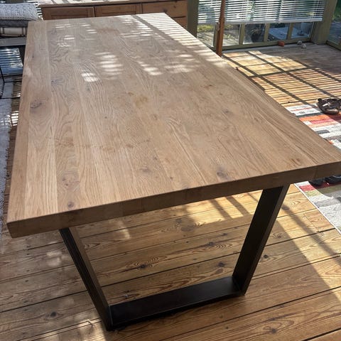 Ilva spisebord, det er ny olieret dog er det brugt i nogle år med brugsspor efter børn. Der er lidt maling og mærker men kan nok godt fjernes med slibning