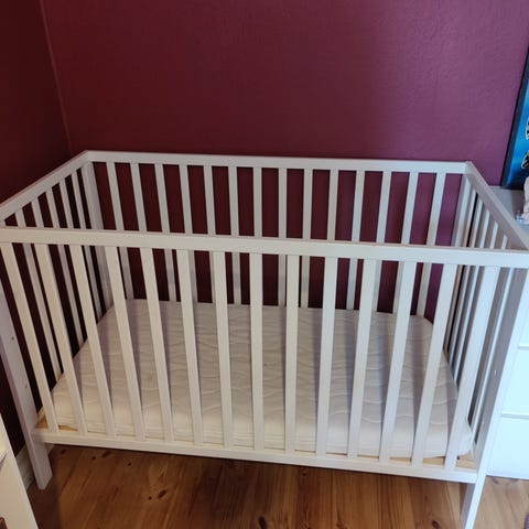 Sød børneseng. Tremmesiderne kan løftes op. Den ene af siderne skal repareres lidt, den er lidt skæv.