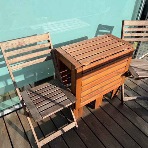 Sæt med havebord og to tilhørende klapstole i træ. Alle dele kan klappes sammen for nem opbevaring.