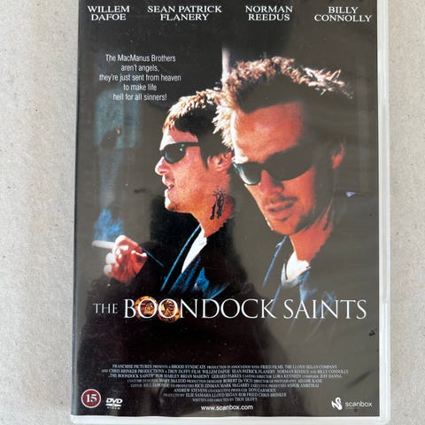 The Boondock Saints DVD film. Standard DVD-udgave af spillefilmen The Boondock Saints. Forsiden viser titel og aldersmærkning 15 år. Velegnet til afspilning på DVD-afspillere, der understøtter almindelige DVD-videoer.