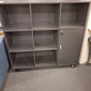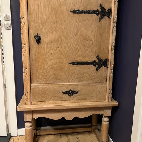 Skab/ møbel i birkekrydsfiner, med flere ruminddelinger, hylder og åbne sektioner til opbevaring. Kan bruges i entré til ophæng af nøgler.