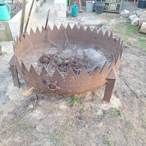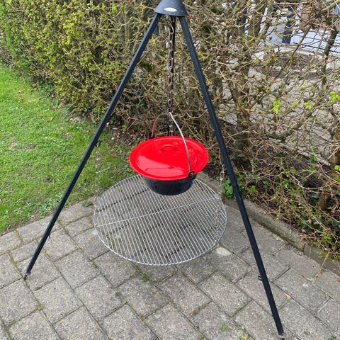 Bålgrill med rund ildskål og hængende, rund grillrist i metal. Grillen står på et stabilt trefodsstativ og har håndtag til flytning. Der er monteret et sidebord i træ til afsætning af grillredskaber eller madvarer. Velegnet til udendørs madlavning over åben ild eller kul, hvor den hængende rist kan justeres i højden over bålet.