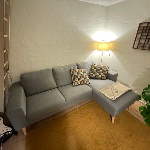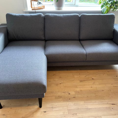 Flot grå chaiselong sofa. 3 personers. Brugt men i flot stand, dog med enkelte mærker/pletter (er ikke forsøgt renset væk!). Sælges, da ny er købt.