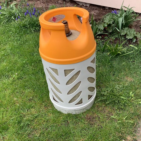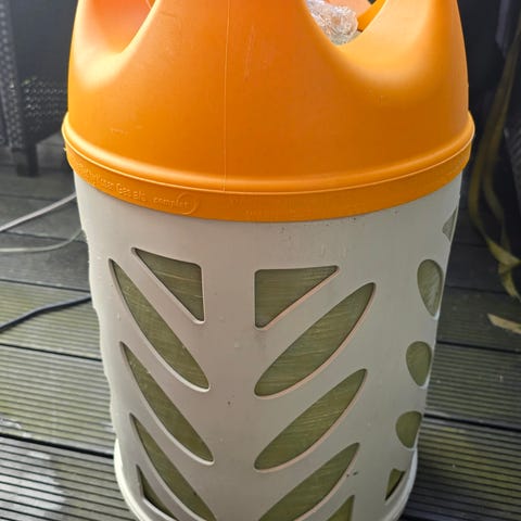 Gasflaske 10kg, Kosan gas light kompositmateriale, den er tom. Flasken har ventil i toppen og er egnet til opbevaring og brug af gas, f.eks. til grill, varmeapparater eller andre gasdrevne apparater. Kompositkonstruktionen gør flasken lettere end traditionelle stålflasker og med åbne sider, så gasniveauet lettere kan kontrolleres visuelt.