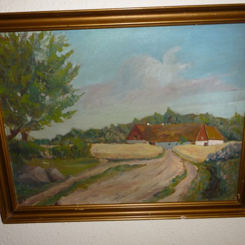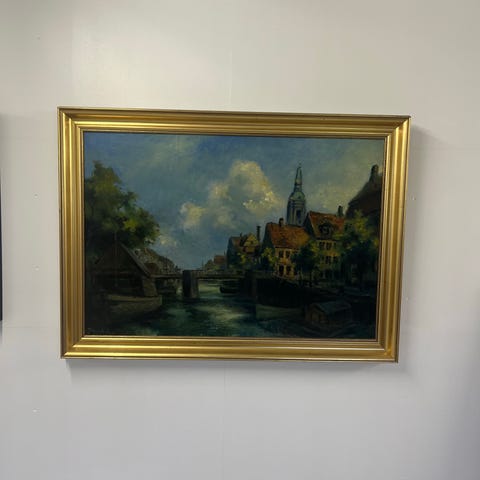 V. Jespersen maleri bymotiv med bro og bygninger i guldramme