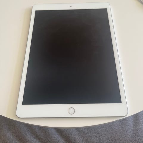 Apple iPad tablet med 128 GB lagerplads. Enheden har touchskærm på forsiden og hjemknap nederst. Velegnet til brug af apps, internet, streaming, spil og tekstbehandling. Opladerkabel medfølger.