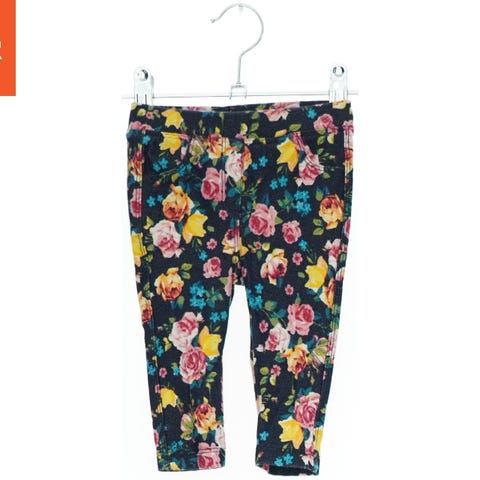 Et par leggings med et blomstret mønster i forskellige farver som gul, rosa, blå og grøn på en mørkeblå baggrund.