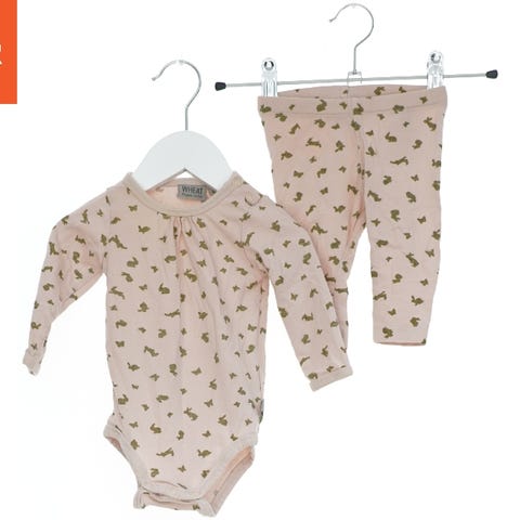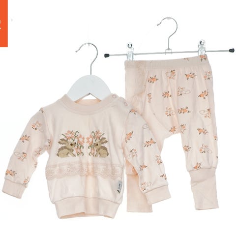 Et baby sæt bestående af en langærmet lyserød bluse dekoreret med flæser på skuldrene og et broderet ord nederst. Bukserne er lyserøde med et mønster af små hjerter. Bagsiden af blusen har lukning med to knapper. Bukserne har elastik i livet.