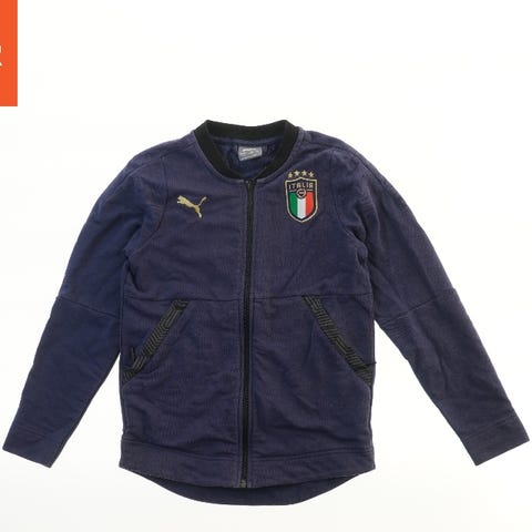 Træningsjakke med lang lynlås foran og hævet krave. Jakken har et logo på brystet og en orange vandret stribe med tynd hvid kant over maven. Jakken har to lommer med lynlås foran.