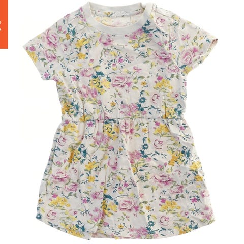 Kjole med korte ærmer og elastik i taljen. Den har et farverigt bladprint med forskellige nuancer af grøn, lyserød, gul og sort. Kjolen er lavet af let materiale og har rund halsudskæring.