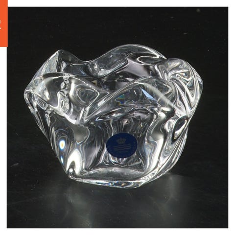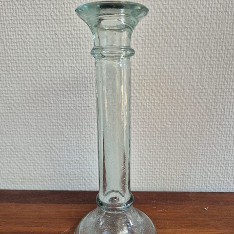 Objektet er en glas lysestage fra holmegaard med en størrelse på 11 cm i diameter. Den har en rund, bølget form og er klar i farven. Lysestagen er designet til at holde et lys i midten. Objektet ser glat ud med reflekterende overflader.
