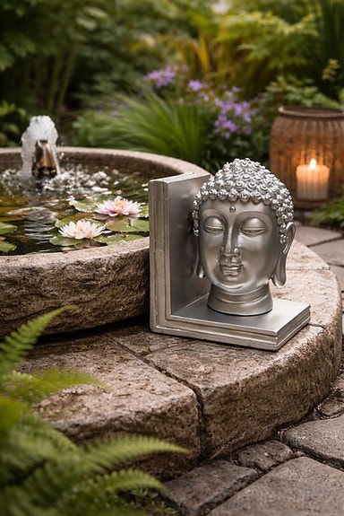 Dette er en organisk formet udskåret træbørsteholder, der har detaljerede udskæringer af fyrretræer og klippeagtige landskaber, hvilket skaber en rolig og poetisk scene.