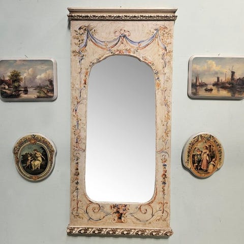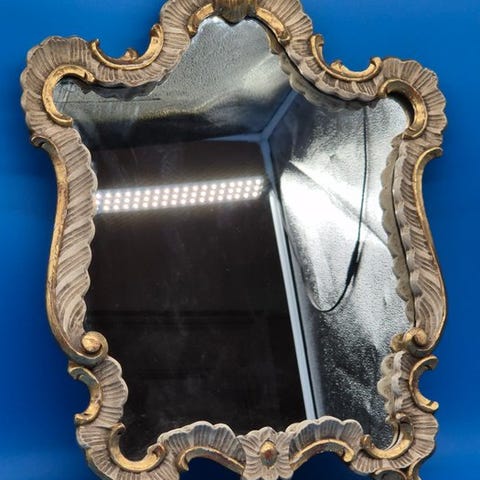 Et stort trægulv-spejl fra Frankrig, dateret ca. 1930–1940, med ydre mål 113 × 82 cm og indre 69 × 70 cm, i god stand med små aldersmærker og pletter. Klik på den blå "gå til varen" knap, for at købe eller byde på denne vare. Den samlede pris vil blive vist inden du afgiver dit bud.